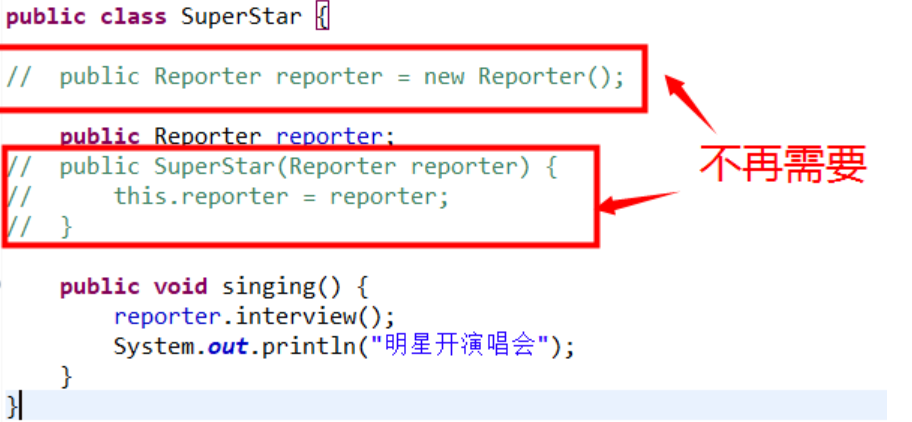 1 //构造方法注入 2 public class UserServiceImpl implements UserService { 3 4 private UserMapper userMapper; 5 6 /** 7 * 构造方法注入 8 * @param userMapper 9 */ 10 public UserServiceImpl(UserMapper userMapper) { 11 this.userMapper = userMapper; 12 } 13 14 @Override 15 public void test() { 16 userMapper.test(); 17 } 18 19 }