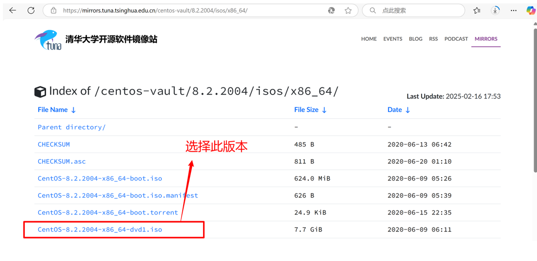 下载地址:https://mirrors.tuna.tsinghua.edu.cn/centos-vault/8.2.2004/isos/x86_64/