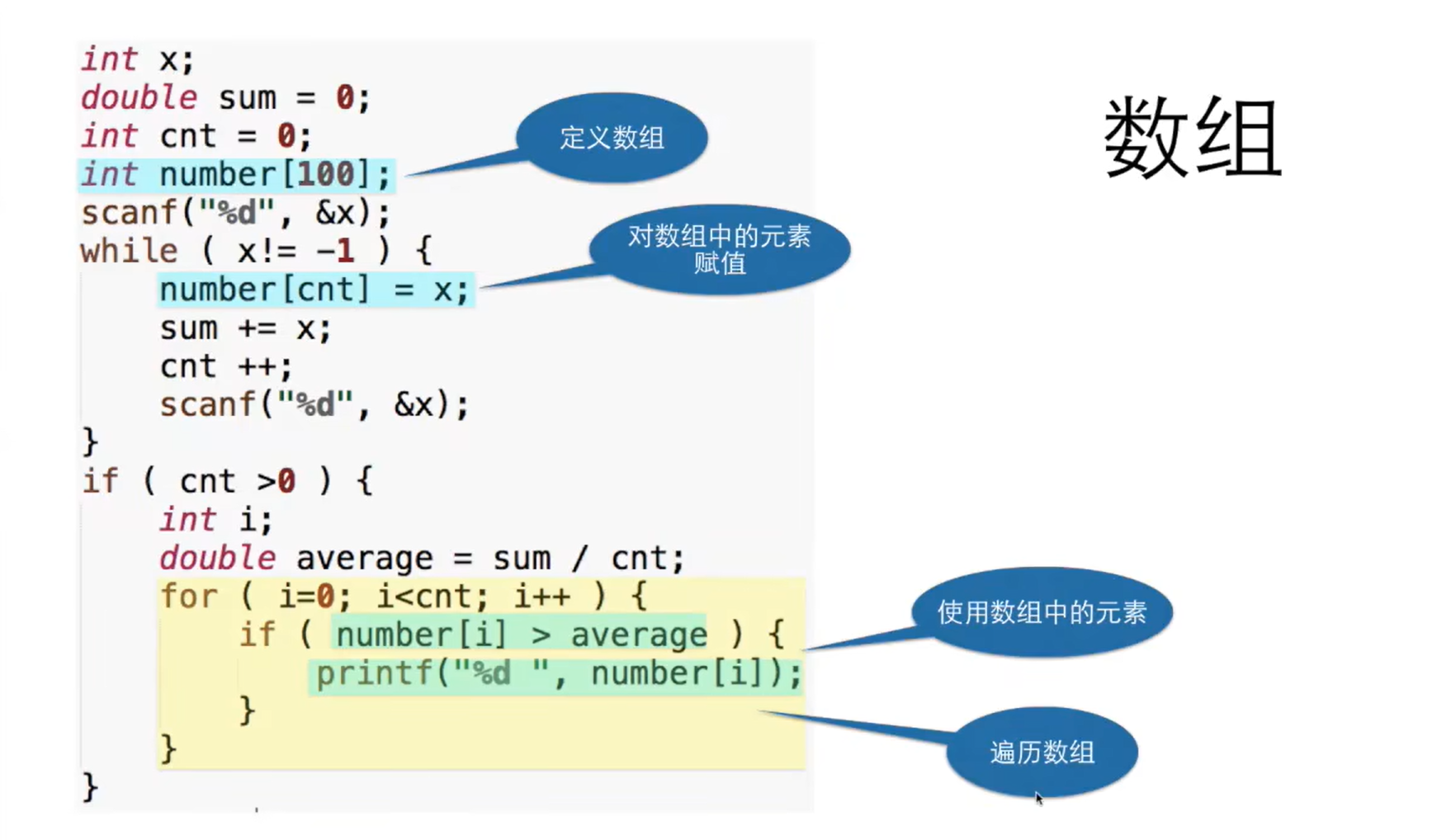 通常都是使用for循环,让循环变量i从0到<数组长度,这样的循环体内最大的i正好是数组最大的有效下标。常见错误: