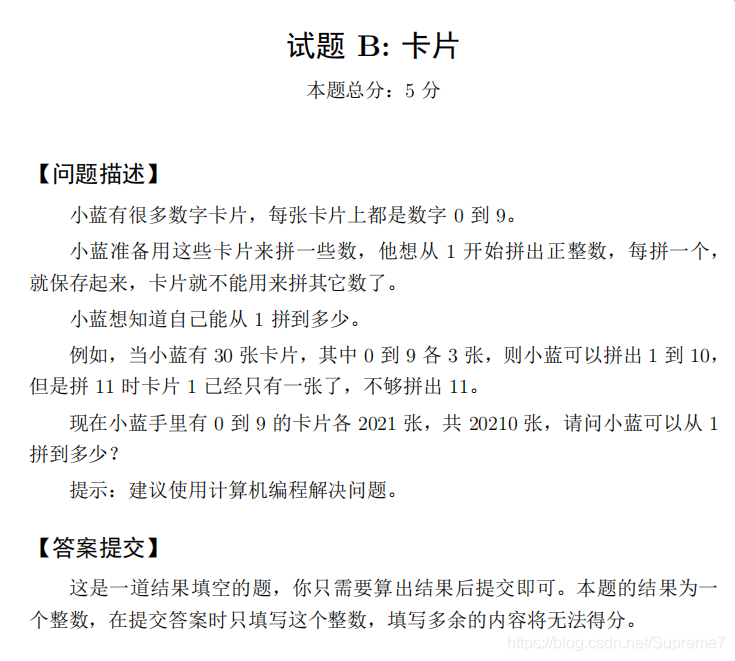 现在小蓝手里有0到9的卡片各2021张,共20210张,请问小蓝可以从1