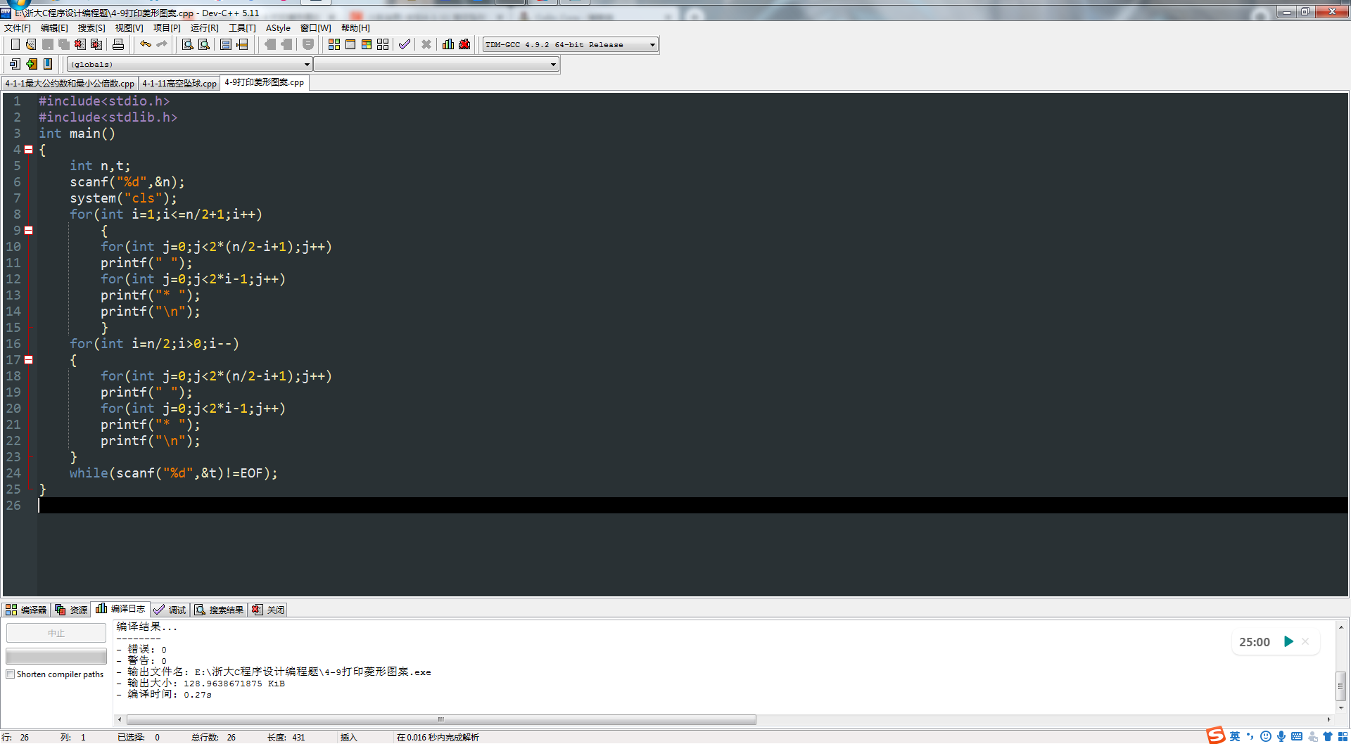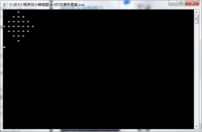 1 #include <stdio.h> 2 int main() 3 { 4 int n; 5 scanf("%d", &n); 6 for (int i = 1; i <= n / 2 + 1; i++) 7 { 8 for (int j = 0; j < 2 * (n / 2 - i + 1); j++) 9 printf(" "); 10 for (int j = 0; j < 2 * i - 1; j++) 11 printf("* "); 12 printf("\n"); 13 } 14 for (int i = n / 2; i > 0; i--) 15 { 16 for (int j = 0; j < 2 * (n / 2 - i + 1); j++) 17 printf(" "); 18 for (int j = 0; j < 2 * i - 1; j++) 19 printf("* "); 20 printf("\n"); 21 } 22 23 return 0; 24 }