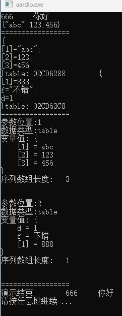 //表的显示有几个函数,作用大致相同,看习惯使用: dumpTable(tab)、 dump(tab,tab2) 、varDump(tab,tab2)