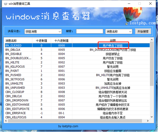 举个例子,当我们点击按钮button控件时,button控件向它的父窗口发送wm_command消息,消息的wParam参数包含了此消息的控件id(button的id)和控件通知代码(bn_clicked),下面两图是查询工具和在msdn中查到的便于理解。