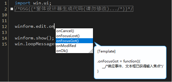 aardio 一些控件的通知代码再进一步封装成好用的函数不需要再判断,使用方法输入”控件.on”前缀智能提示就出来了:),如下图edit获得焦点,大家可以试试其它控件