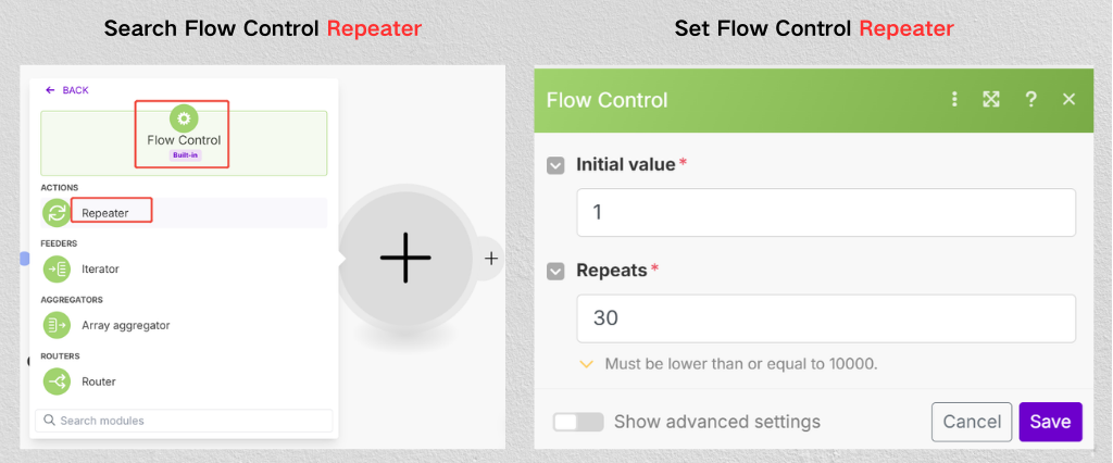 添加flow control repeater以重复下一个过程(来自 ComPDFKit PDF Converter 的 GetFileInformation)。然后,按如下所示进行设置: