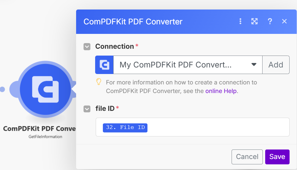 从 ComPDFKit PDF Converter 添加 GetFileInformation 并对其进行配置。