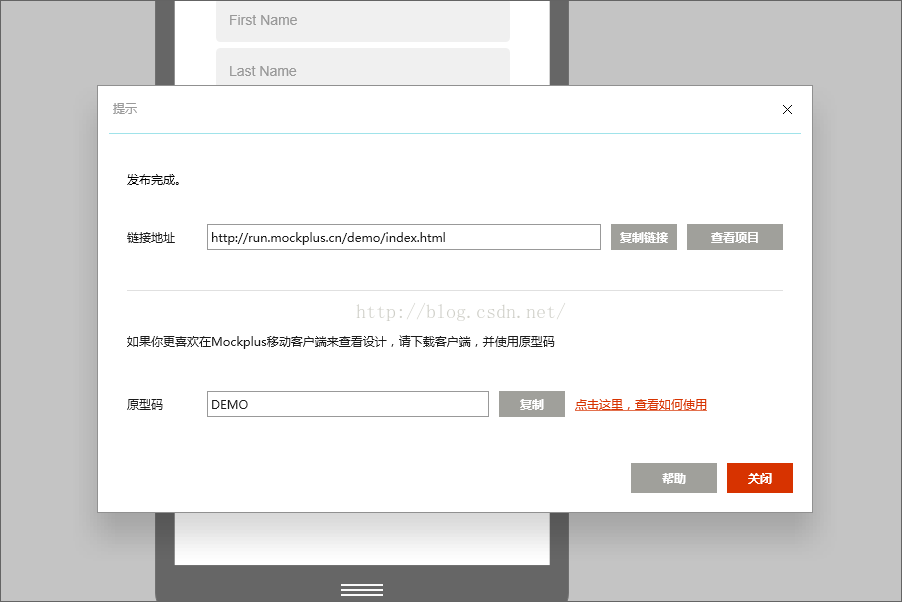 操作方式:在主工具栏,点击“发布”。发布完成后,即可获得一个原型码,将这个原型码发送给同事或客户。
