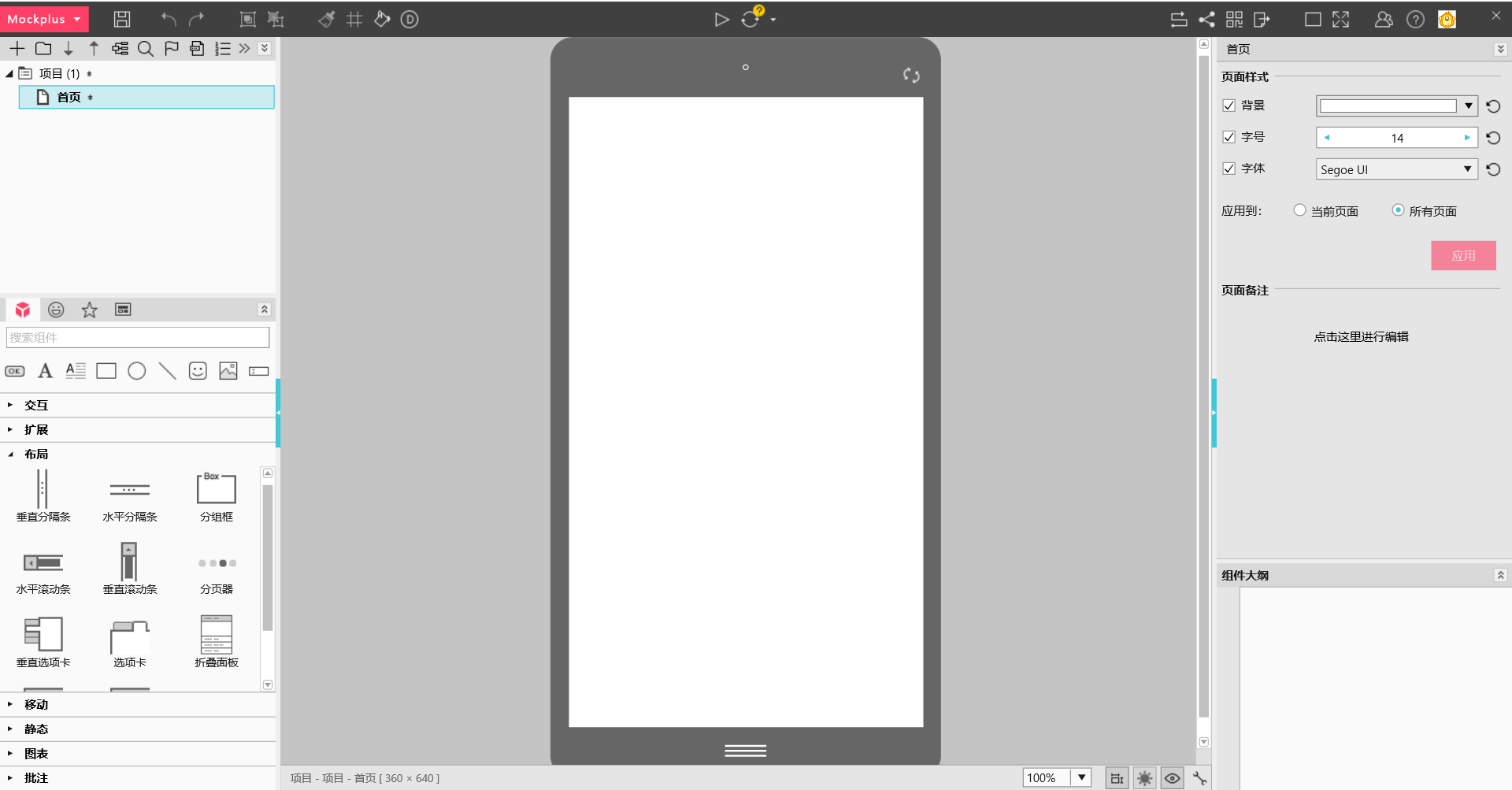 界面上方的主工具栏提供了演示、同步等各种快捷按钮。界面的中央区域是工作区,在这里完成设计工作。底部是项目状态栏,所在页面位置及页面尺寸等信息会显示在这里。工作区左侧上半部分是项目树,可以清楚地看到整体项目的页面结构。工作区左侧下半部分分为四个板块,分别为组件库、图标库、我的组件库、母版库,可以方便地切换想要的板块。