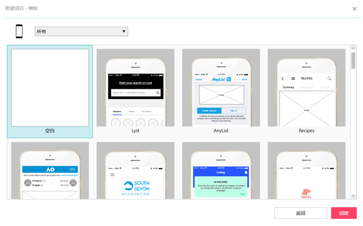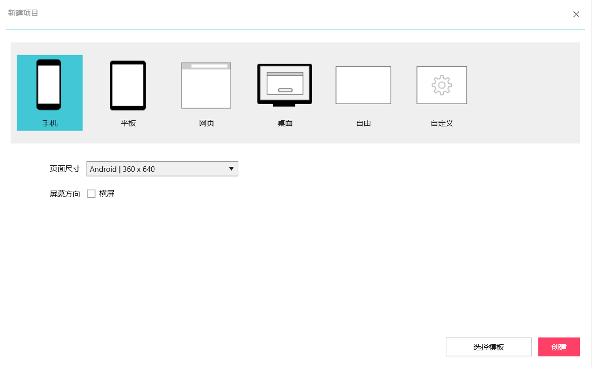 在进入软件,点击新建项目后,新窗口会显示默认支持的原型类型。软件提供了多种项目,每种项目中均内置了常用设备数据供快速选择,也可以自定义尺寸等。选择好所需项目后即可新建个人项目。