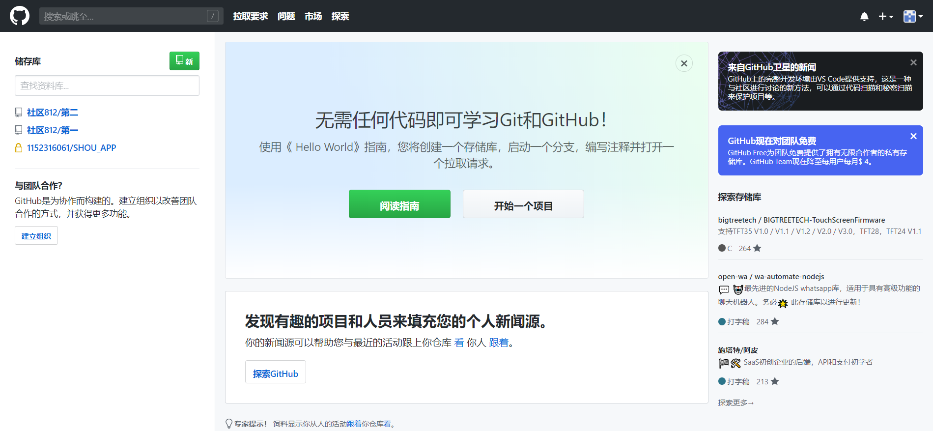 注册完登录之后,会进入GitHub的基本页面,如下图所示。在页面中间可以很容易地看到Git和GitHub的指南,能帮助我们快速上手这一工具。