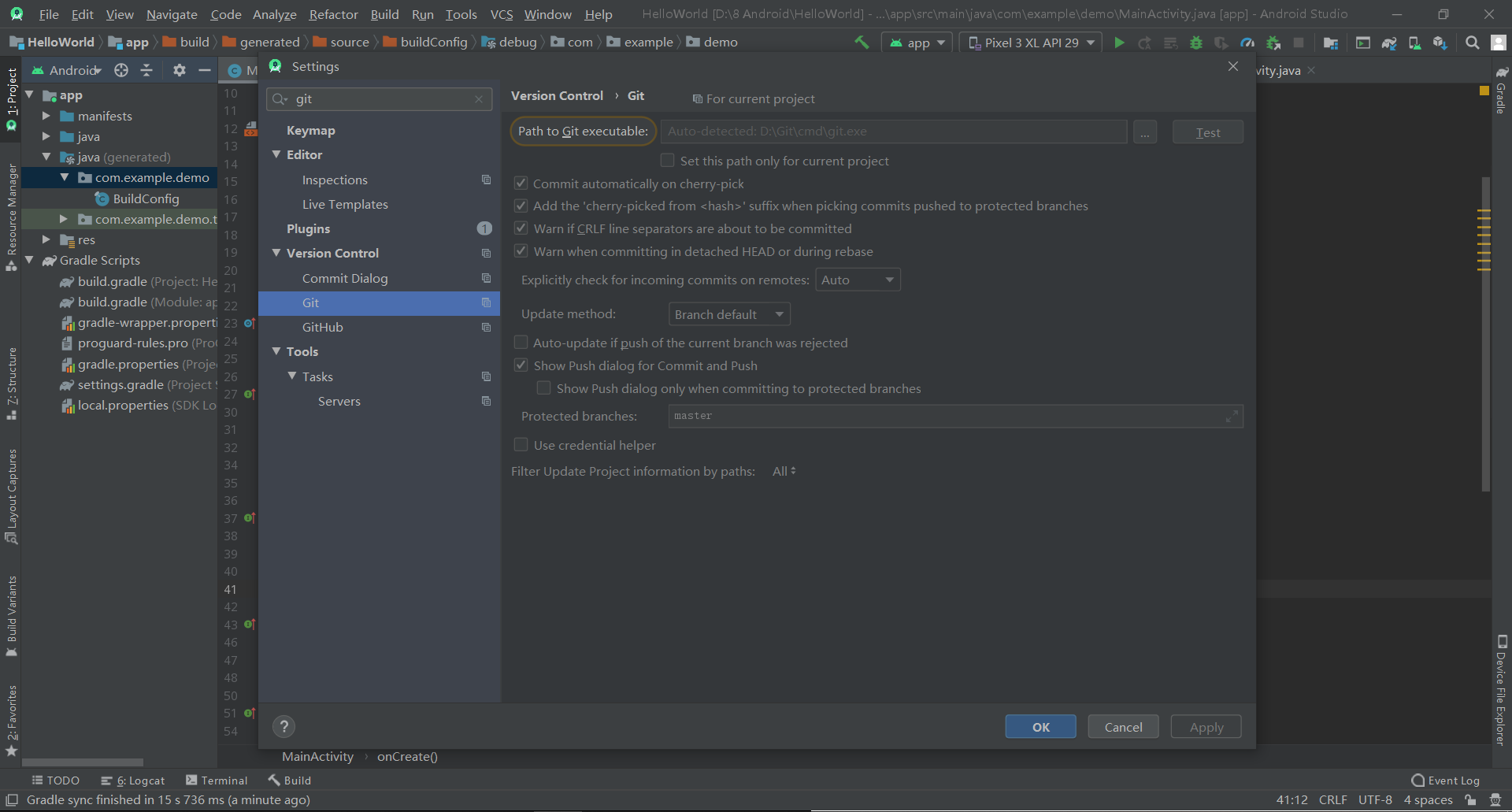 启动Android Studio,打开如下路径File->Settings->Version Control->git在Path to Git executable后面的输入框输入你安装的git路径。