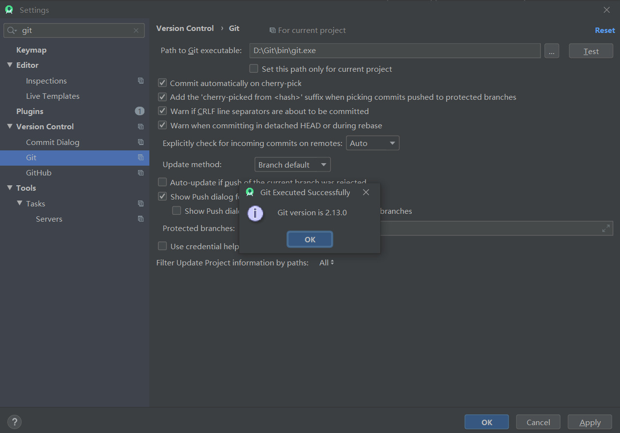 点击test按钮如果出现 Git executed successfully 对话框说明配置成功,同时对话框会显示你安装的git版本号。
