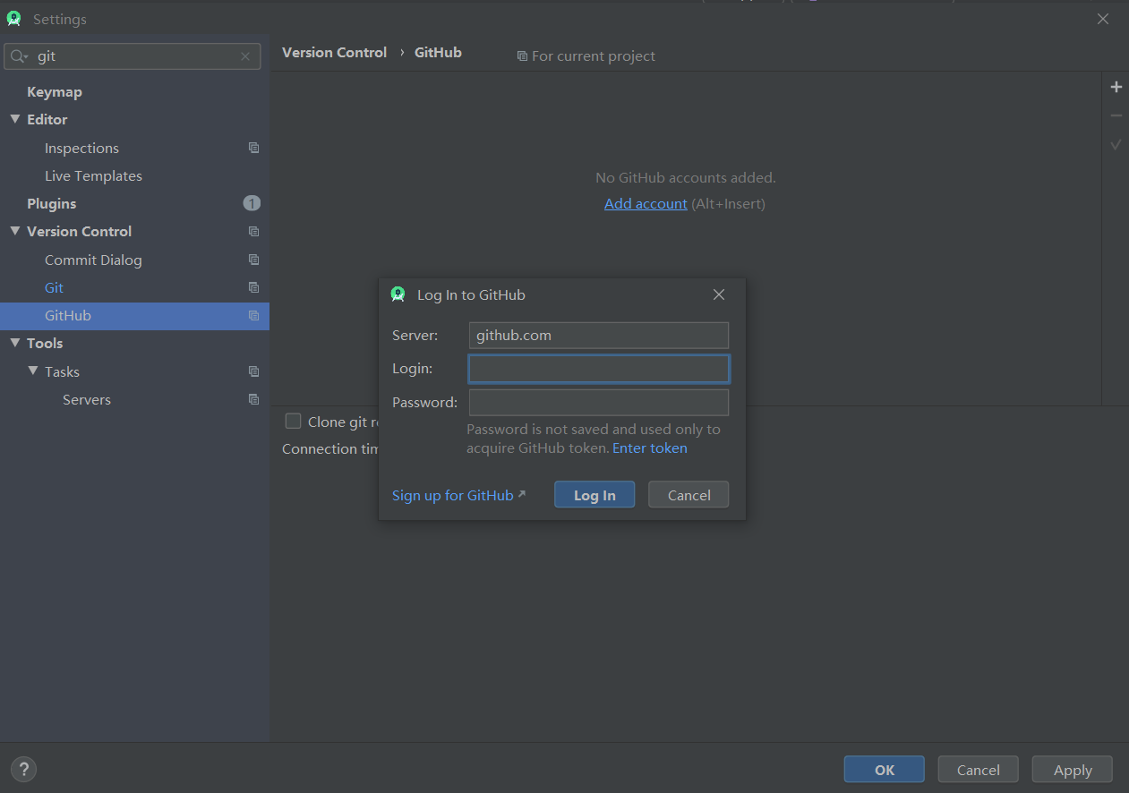 然后配置Github登陆信息,打开如下路径File->Settings->Version Control->GitHub。