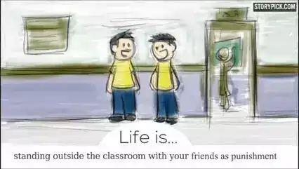 和好朋友在教室外面一起罚站。