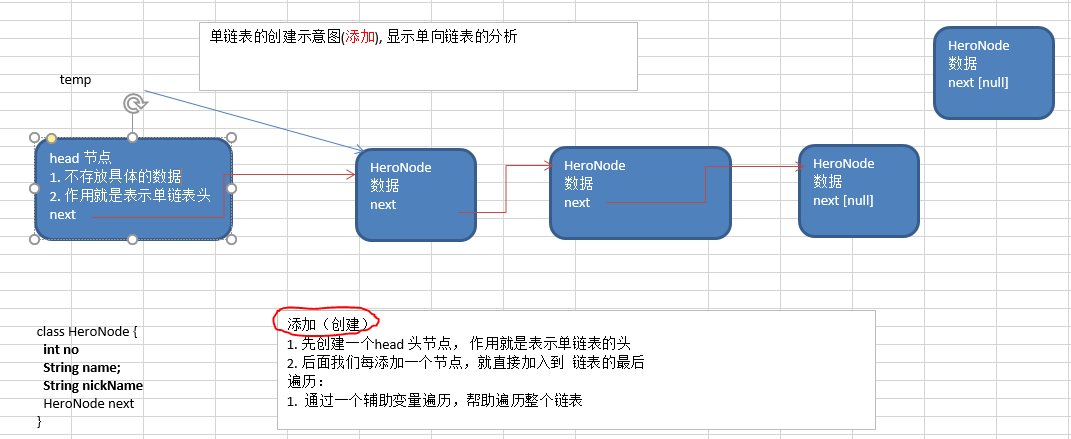 1 /** 2 * 将新节点加入链表 3 * 当不考虑编号时 4 * 思路:1、遍历链表,找到next=null的尾节点 5 * 2、将尾节点的next指向新节点 6 * @param heroNode 需要添加的新节点 7 */ 8 public void addNode(HeroNode heroNode){ 9 //遍历链表,找到结尾,在结尾处加入新的节点 10 HeroNode temp=headNode;//头结点不能动,需要辅助变量来遍历 11 while (true){ 12 if (temp.next == null) { 13 break; 14 } 15 //将节点后移 16 temp=temp.next; 17 } 18 //将新节点加到尾部 19 temp.next=heroNode; 20 }
