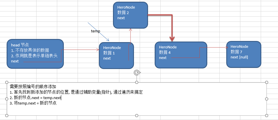 1 /** 2 第二种方式在添加英雄时,根据排名将英雄插入到指定位置(如果有这个排名, 则添加失败, 并给出提示 3 * @param heroNode 4 */ 5 public void addNodeSort(HeroNode heroNode){ 6 //对链表进行遍历 7 HeroNode temp=headNode; 8 boolean flag=false; 9 while (true){ 10 if (temp.next == null) { 11 break; 12 } 13 //如果有这个排名, 则添加失败, 并给出提示 14 if (temp.next.no==heroNode.no){ 15 flag=true; 16 break; 17 } 18 if ( heroNode.no<temp.next.no){ 19 break; 20 } 21 temp=temp.next; 22 } 23 if (flag){ 24 System.out.printf("已有此编号%d,无法加入\n",heroNode.no); 25 }else { 26 heroNode.next=temp.next; 27 temp.next=heroNode; 28 } 29 }