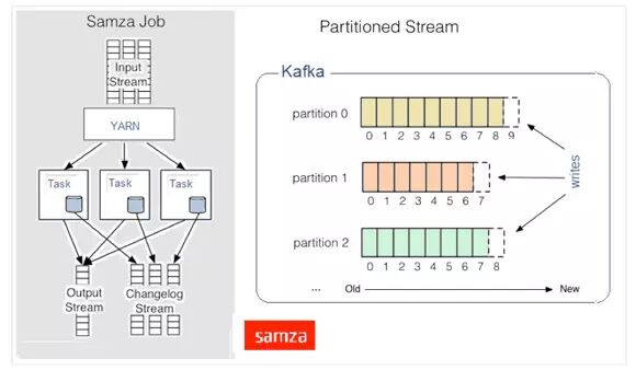 Samza处理数据流时,会分别按次处理每条收到的消息。Samza的流单位既不是元组,也不是Dstream,而是一条条消息。在Samza中,数据流被切分开来,每个部分都由一组只读消息的有序数列构成,而这些消息每条都有一个特定的ID(offset)。该系统还支持批处理,即逐次处理同一个数据流分区的多条消息。Samza的执行与数据流模块都是可插拔式的,尽管Samza的特色是依赖Hadoop的Yarn(另一种资源调度器)和Apache Kafka。