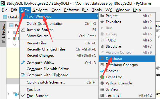 知识拓展:通过菜单打开Data Sources and Driver 窗口的方法。(在PyCharm菜单中,View-->Tool Windows --> database-->按+号-->Data Source-->PostgreSQL)