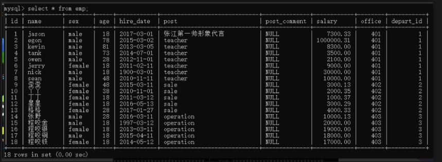 1 #三个部门:教学,销售,运营 2 insert into 3 emp(name,sex,age,hire_date,post,salary,office,depart_id) values 4 ('jason','male',18,'20170301','张江第一帅形象代言',7300.33,401,1), 5 #以下是教学部 6 ('egon','male',78,'20150302','teacher',1000000.31,401,1), 7 ('kevin','male',81,'20130305','teacher',8300,401,1), 8 ('tank','male',73,'20140701','teacher',3500,401,1), 9 ('owen','male',28,'20121101','teacher',2100,401,1), 10 ('jerry','female',18,'20110211','teacher',9000,401,1), 11 ('nick','male',18,'19000301','teacher',30000,401,1), 12 ('sean','male',48,'20101111','teacher',10000,401,1), 13 ('歪歪','female',48,'20150311','sale',3000.13,402,2),#以下是销售部门 14 ('丫丫','female',38,'20101101','sale',2000.35,402,2), 15 ('丁丁','female',18,'20110312','sale',1000.37,402,2), 16 ('星星','female',18,'20160513','sale',3000.29,402,2), 17 ('格格','female',28,'20170127','sale',4000.33,402,2), 18 ('张野','male',28,'20160311','operation',10000.13,403,3), 19 #以下是运营部门 20 ('程咬金','male',18,'19970312','operation',20000,403,3), 21 ('程咬银','female',18,'20130311','operation',19000,403,3), 22 ('程咬铜','male',18,'20150411','operation',18000,403,3), 23 ('程咬铁','female',18,'20140512','operation',17000,403,3) 24 ; 25 #ps:如果在windows系统中,插入中文字符,select的结果为空白,可以将所有字符编码统一设置成gbk