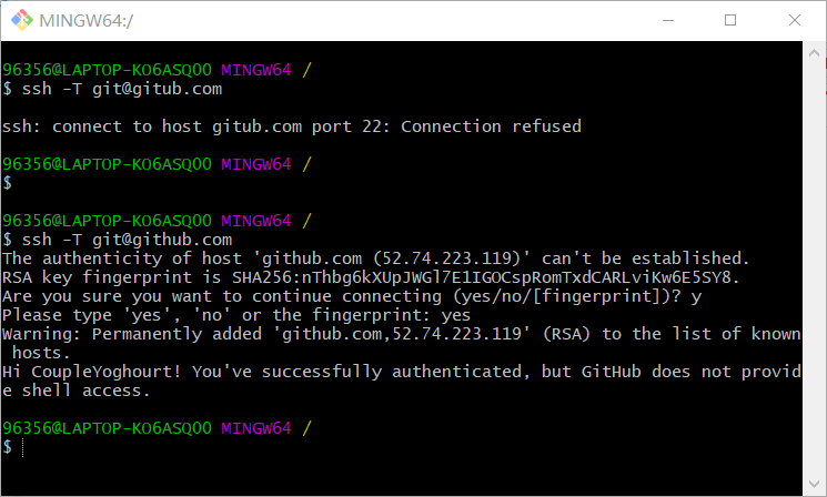 接着验证是否成功,得到下图,验证建立ssh key成功 | |