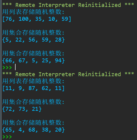 1 import random 2 print('用列表存储随机整数: ') 3 ls = [random.randint(1, 100) for i in range(5)] 4 print(ls) 5 print('\n用集合存储随机整数: ') 6 s1 = {random.randint(1,100) for i in range(5)} 7 print(s1) 8 print('\n用集合存储随机整数: ') 9 s2 = set() 10 while(len(s2)<5): 11 s2.add(random.randint(1,100)) 12 print(s2)
