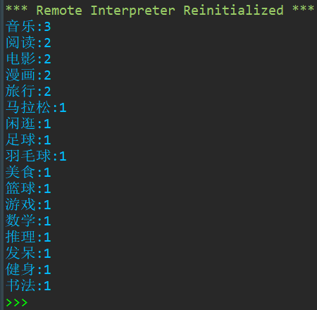 1 datas = {'2049777001': ['篮球', '羽毛球', '美食', '漫画'], 2 '2049777002': ['音乐', '旅行'], 3 '2049777003': ['马拉松', '健身', '游戏'], 4 '2049777004': [], 5 '2049777005': ['足球', '阅读'], 6 '2049777006': ['发呆', '闲逛'], 7 '2049777007': [], 8 '2049777008': ['书法', '电影'], 9 '2049777009': ['音乐', '阅读', '电影', '漫画'], 10 '2049777010': ['数学', '推理', '音乐', '旅行'] 11 } 12 cishu = {} 13 aihao = [] 14 aihao1 = set() 15 16 for i in datas.keys(): 17 for n in datas[i]: 18 aihao.append(n) 19 aihao1.add(n) 20 aihao1 = list(aihao1) 21 22 for i in aihao1: 23 cishu.setdefault(i,aihao.count(i)) 24 cishu = list(zip(cishu.values(),cishu.keys())) 25 cishu.sort(reverse=True) 26 for i in range(len(cishu)): 27 print('{}:{}'.format(cishu[i][1],cishu[i][0]))