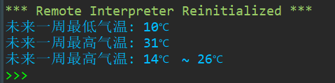 1 temperatures= [['2022-04-18', '星期一', '10', '22'], 2 ['2022-04-19', '星期二', '10', '22'], 3 ['2022-04-20', '星期三', '12', '25'], 4 ['2022-04-21', '星期四', '13', '28'], 5 ['2022-04-22', '星期五', '16', '31'], 6 ['2022-04-23', '星期六', '19', '31'], 7 ['2022-04-24', '星期日', '19', '27']] 8 diwen = [] 9 gaowen = [] 10 for i in range(len(temperatures)): 11 diwen.append(temperatures[i][2]) 12 gaowen.append(temperatures[i][3]) 13 sum_zuidiwen = 0 14 sum_zuigaowen = 0 15 for i,n in zip(diwen,gaowen): 16 sum_zuidiwen = sum_zuidiwen + int(i) 17 sum_zuigaowen = sum_zuigaowen + int(n) 18 average_zuidiwen = sum_zuidiwen / len(temperatures) 19 average_zuigaowen = sum_zuigaowen / len(temperatures) 20 zuidiwen = min(diwen) 21 zuigaowen = max(gaowen) 22 print('未来一周最低气温: {}℃'.format(zuidiwen)) 23 print('未来一周最高气温: {}℃'.format(zuigaowen)) 24 print('未来一周最高气温: {}℃ ~ {}℃'.format(int(average_zuidiwen),int(average_zuigaowen)))