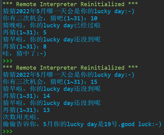 1 print('猜猜2022年5月哪一天会是你的lucky day:-)') 2 import random 3 xingyunshuzi = random.randint(1,31) 4 caice = eval(input('你有三次机会,猜吧(1~31):')) 5 i = 1 6 while(i<=3): 7 if(caice < xingyunshuzi): 8 if(i == 3): 9 print('次数用光啦.\n偷偷告诉你,5月你的lucky day是{}号.good luck:-)'.format(xingyunshuzi)) 10 break 11 print('猜早啦,你的lucky day还没到呢') 12 caice = eval(input('再猜(1~31):')) 13 i = i + 1 14 elif(caice > xingyunshuzi): 15 if(i == 3): 16 print('次数用光啦.\n偷偷告诉你,5月你的lucky day是{}号.good luck:-)'.format(xingyunshuzi)) 17 break 18 print('猜晚啦,你的lucky day已经过啦') 19 caice = eval(input('再猜(1~31):')) 20 i = i + 1 21 else: 22 print('哇,猜中了:-)') 23 break 24 else: 25 print('次数用光啦.\n偷偷告诉你,5月你的lucky day是{}号.good luck:-)'.format(xingyunshuzi))