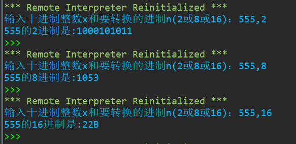 1 x,n = eval(input('输入十进制整数x和要转换的进制n(2或8或16):')) 2 cunchu = x 3 jinzhi = [] 4 if(n == 2 or n == 8): 5 while(x != 0): 6 a = x%n 7 x = x//n 8 jinzhi.append(str(a)) 9 jinzhi = ''.join(jinzhi)[::-1] 10 else: 11 while(x != 0): 12 a = x%n 13 x = x//n 14 jinzhi.append(a) 15 for i in range(len(jinzhi)): 16 if(jinzhi[i] == 10): 17 jinzhi[i] = 'A' 18 elif(jinzhi[i] == 11): 19 jinzhi[i] = 'B' 20 elif(jinzhi[i] == 12): 21 jinzhi[i] = 'C' 22 elif(jinzhi[i] == 13): 23 jinzhi[i] = 'D' 24 elif(jinzhi[i] == 14): 25 jinzhi[i] = 'E' 26 elif(jinzhi[i] == 15): 27 jinzhi[i] = 'F' 28 for i in range(len(jinzhi)): 29 jinzhi[i] = str(jinzhi[i]) 30 jinzhi = ''.join(jinzhi)[::-1] 31 print('{}的{}进制是:{}'.format(cunchu,n,jinzhi))