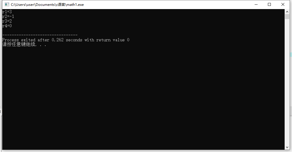 #include <stdio.h> int main(){ int x,y; int r1,r2,r3,r4; x=1; y=2; r1=x+y; r2=x-y; r3=x*y; r4=x/y; printf("r1=%d\n",r1); printf("r2=%d\n",r2); printf("r3=%d\n",r3); printf("r4=%d\n",r4); return 0; }