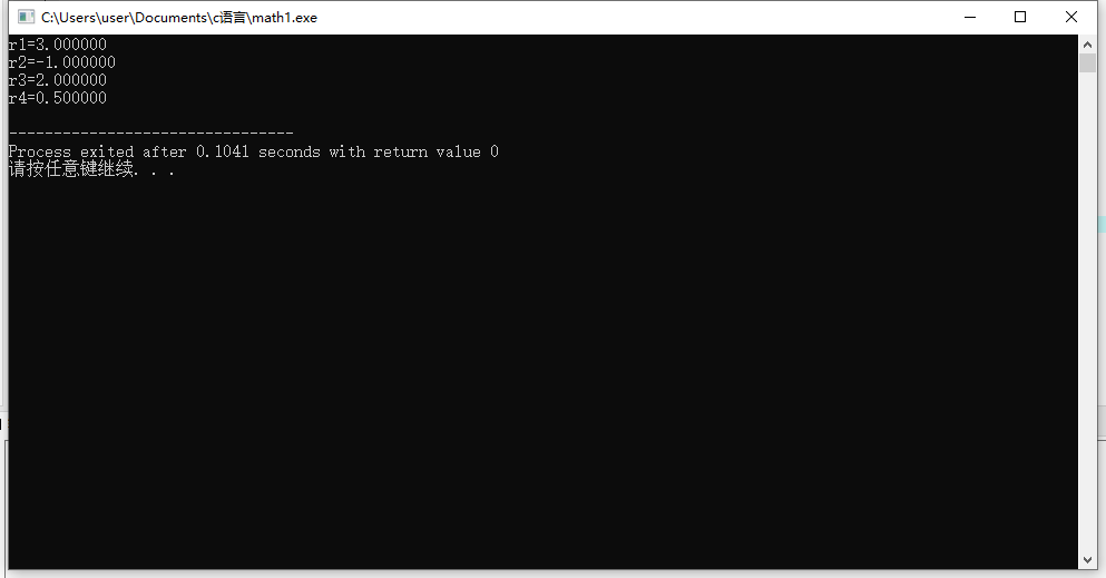 #include <stdio.h> int main(){ float x,y; float r1,r2,r3,r4; x=1; y=2; r1=x+y; r2=x-y; r3=x*y; r4=x/y; printf("r1=%f\n",r1); printf("r2=%f\n",r2); printf("r3=%f\n",r3); printf("r4=%f\n",r4); return 0; }