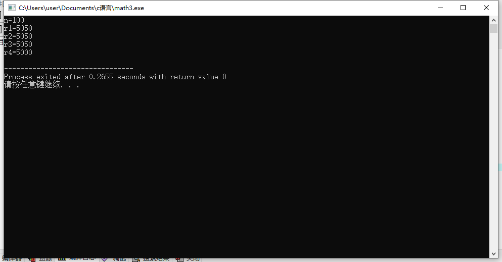 #include <stdio.h> int main() { int n,r1,r2,r3,r4; n=100; r1=n*(n+1)/2; r2=(n+1)*n/2; r3=n/2*(n+1); r4=(n+1)/2*n; printf("n=%d\n",n); printf("r1=%d\n",r1); printf("r2=%d\n",r2); printf("r3=%d\n",r3); printf("r4=%d\n",r4); return 0; }