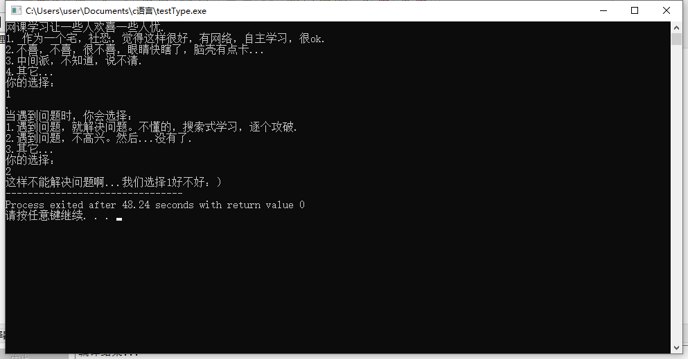 #include <stdio.h> int main(){ int answer; char words[5000]; printf("网课学习让一些人欢喜一些人忧.\n"); printf("1. 作为一个宅,社恐,觉得这样很好,有网络,自主学习,很ok.\n"); printf("2.不喜,不喜,很不喜,眼睛快瞎了,脑壳有点卡...\n"); printf("3.中间派,不知道,说不清.\n"); printf("4.其它...\n"); printf("你的选择:\n"); scanf("%d",&answer); if(answer==4){ printf("请补充你的想法:\n"); getchar(); gets(words); } printf(".\n"); printf("当遇到问题时,你会选择:\n"); printf("1.遇到问题,就解决问题。不懂的,搜索式学习,逐个攻破.\n"); printf("2.遇到问题,不高兴。然后...没有了.\n"); printf("3.其它...\n"); printf("你的选择:\n"); scanf("%d",&answer); if(answer==1) printf(":)\n"); else if(answer==2) printf("这样不能解决问题啊...我们选择1好不好:)"); else if(answer==3){ printf("请补充你的想法:\n"); getchar(); gets(words); } return 0; }