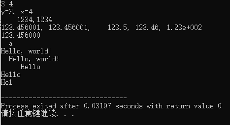 #include <stdio.h> int main() { int x=1234; float f=123.456; double m=123.456; char ch='a'; char a[]="Hello, world!"; int y=3, z=4; printf("%d %d\n", y, z); printf("y=%d, z=%d\n", y,z); printf("%8d,%2d\n", x,x); printf("%f, %8f, %8.1f, %0.2f, %.2e\n",f,f,f,f,f); printf("%lf\n",m); printf("%3c\n", ch); printf("%s\n%15s\n%10.5s\n%2.5s\n%.3s\n",a,a,a,a,a); return 0; }