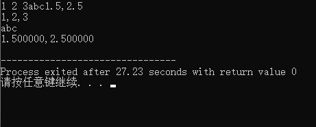 #include <stdio.h> int main() { double x,y; char c1,c2,c3; int a1,a2,a3; scanf("%d%d%d",&a1,&a2,&a3); printf("%d,%d,%d\n",a1,a2,a3); scanf("%c%c%c",&c1,&c2,&c3); printf("%c%c%c\n",c1,c2,c3); scanf("%lf,%lf",&x,&y); printf("%f,%lf\n",x,y); return 0; }