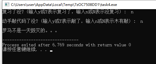 #include <stdio.h> int main() { char ans1, ans2; printf("复习了没? (输入y或Y表示复习了,输入n或N表示没复习) : "); ans1 = getchar(); getchar(); printf("\n动手敲代码了没? (输入y或Y表示敲了,输入n或N表示木有敲) : "); ans2 = getchar(); if(ans1=='y'&&ans2=='y'||ans1=='y'&&ans2=='Y'||ans1=='Y'&&ans2=='y'||ans1=='Y'&&ans2=='Y') printf("\n罗马不是一天建成的:)\n"); else printf("\n罗马不是一天毁灭的。。。\n"); return 0; }