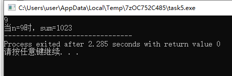 #include <stdio.h> #include<math.h> int main(){ int n,sum; scanf("%d",&n); if(n>=1&&n<=9){ sum=(1-pow(2,n+1))/(1-2); printf("当n="); printf("%d",n); printf("时,sum="); printf("%d",sum); } else printf("你的输入不合法."); return 0; }