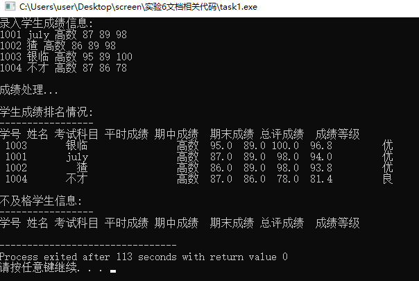 #include<stdio.h> #include<stdlib.h> #include<string.h> #define N 4 // 运行程序输入测试时,可以把N改小一些输入测试 typedef struct student { int id; /*学生学号 */ char name[20]; /*学生姓名 */ char subject[20]; /*考试科目 */ float perf; /*平时成绩 */ float mid; /* 期中成绩 */ float final; /* 期末成绩 */ float total; /* 总评成绩 */ char level[10]; /* 成绩等级 */ } STU; void input(STU[],int ); /*输入学生信息 */ void calc(STU[],int); /*计算总评和等级 */ int fail(STU[],STU [],int); /*不及格学生统计 */ void sort(STU[],int); /*排序 */ void print(STU[], int); /*输出学生信息*/ int main() { STU st[N],fst[N]; // 数组st记录学生信息,fst记录不及格学生信息 int k; // 用于记录不及格学生个数 printf("录入学生成绩信息:\n"); input(st,N); printf("\n成绩处理...\n"); calc(st,N); k = fail(st,fst,N); sort(st, N); printf("\n学生成绩排名情况:\n"); print(st, N); printf("\n不及格学生信息:\n"); print(fst, k); return 0; } // 输入学生信息 void input(STU s[],int n) { int i; for(i=0;i<n;i++) scanf("%d %s %s %f %f %f",&s[i].id,s[i].name,s[i].subject,&s[i].perf,&s[i].mid,&s[i].final); } // 计算总评和等级 void calc(STU s[],int n) { int i; for(i=0;i<n;i++) { s[i].total=s[i].perf*0.2+s[i].mid*0.2+s[i].final*0.6; if(s[i].total>=90) strcpy(s[i].level,"优"); // 注意:等级是字符型数组,要使用strcpy完成赋值 else if(s[i].total>=80 && s[i].total<90) strcpy(s[i].level,"良"); else if(s[i].total>=70 && s[i].total<80) strcpy(s[i].level,"中"); else if(s[i].total>=60 && s[i].total<70) strcpy(s[i].level,"及格"); else strcpy(s[i].level,"不及格"); } } // 不及格学生统计 // 数组s存放的是所有学生信息,数组t存放不及格学生信息,n是数组s中元素个数 // 函数返回值:返回的是不及格人数 int fail(STU s[],STU t[],int n) { int i,k=0; for(i=0;i<n;i++) if(s[i].total<60) t[k++]=s[i]; return k; } // 根据总评成绩对学生记录信息排序 // 使用的是冒泡排序算法 void sort(STU s[],int n) { int i,j; STU temp; for(i=0;i<n-1;i++) for(j=0;j<n-1-i;j++) if(s[j].total<s[j+1].total) { temp = s[j]; s[j] = s[j+1]; s[j+1] = temp; } } // 输出学生信息 void print(STU s[], int n) { int i; printf("-----------------\n"); printf("学号 姓名 考试科目 平时成绩 期中成绩 期末成绩 总评成绩 成绩等级\n"); for(i=0;i<n;i++) printf("%5d %10s%20s %5.1f %5.1f %5.1f %5.1f %10s\n",s[i].id,s[i].name,s[i].subject,s[i].perf,s[i].mid,s[i].final,s[i].total,s[i].level); }