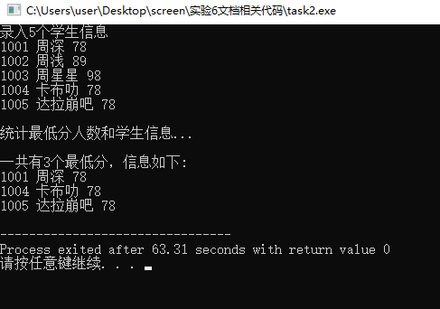 #include <stdio.h> const int N=5; // 定义结构体类型struct student,并定义STU为其别名 typedef struct student { long no; char name[20]; int score; }STU; // 函数声明 void input(STU s[], int n); int findMinlist(STU s[], STU t[], int n); void output(STU s[], int n); int main() { STU stu[N], minlist[N]; int count; printf("录入%d个学生信息\n", N); input(stu, N); printf("\n统计最低分人数和学生信息...\n"); count = findMinlist(stu, minlist, N); printf("\n一共有%d个最低分,信息如下:\n", count); output(minlist, count); return 0; } // 输入n个学生信息,存放在结构体数组s中 void input(STU s[], int n) { int i; for(i=0; i<n; i++) scanf("%ld %s %d", &s[i].no, s[i].name, &s[i].score); } // 输出结构体s中n个元素信息 void output(STU s[], int n) { int i; for(i=0; i<n; i++) printf("%ld %s %d\n", s[i].no, s[i].name, s[i].score); } // 在结构体数组s中,查找最低分学生的记录,将其存入结构体数组t中 // 形参n是结构体数组s中元素个数 // 函数返回最低分的学生人数 int findMinlist(STU s[], STU t[], int n) { int k=0,i,min=s[0].score; for(i=0;i<n;i++){ if(min>s[i].score) min=s[i].score; } for(i=0;i<n;i++){ if(min==s[i].score) t[k++]=s[i]; } return k; }