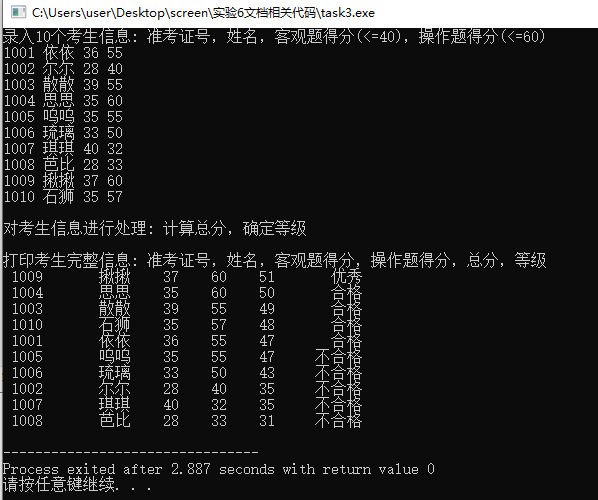 #include <stdio.h> #include <string.h> const int N = 10; // 定义结构体类型struct student,并定义其别名为STU typedef struct student { long int id; char name[20]; float objective; /*客观题得分*/ float subjective; /*操作题得分*/ float sum; char level[10]; }STU; // 函数声明 void input(STU s[], int n); void output(STU s[], int n); void process(STU s[], int n); int main() { STU stu[N]; printf("录入%d个考生信息: 准考证号,姓名,客观题得分(<=40),操作题得分(<=60)\n", N); input(stu, N); printf("\n对考生信息进行处理: 计算总分,确定等级\n"); process(stu, N); printf("\n打印考生完整信息: 准考证号,姓名,客观题得分,操作题得分,总分,等级\n"); output(stu, N); return 0; } // 录入考生信息:准考证号,姓名,客观题得分,操作题得分 void input(STU s[], int n) { int i; for (i=0;i<n;i++) scanf("%ld %s %f %f",&s[i].id,s[i].name,&s[i].objective,&s[i].subjective); } //输出考生完整信息: 准考证号,姓名,客观题得分,操作题得分,总分,等级 void output(STU s[], int n) { int i; for (i=0;i<n;i++) printf("%5ld %10s %5.f %5.f %5.f %10s\n",s[i].id,s[i].name,s[i].objective,s[i].subjective,s[i].sum,s[i].level); } // 对考生信息进行处理:计算总分,排序,确定等级 void process(STU s[], int n) { int i,j,k; STU temp; for (i=0;i<n;i++) s[i].sum=s[i].objective*0.4+s[i].subjective*0.6; for(i=0;i<n-1;i++) for(j=0;j<n-1-i;j++) if(s[j].sum<s[j+1].sum) { temp = s[j]; s[j] = s[j+1]; s[j+1] = temp; } for(i=0;i<n;i++){ k=i+1; if(k<=1) strcpy(s[i].level,"优秀"); else if(k>1&&k<=5) strcpy(s[i].level,"合格"); else strcpy(s[i].level,"不合格"); } }