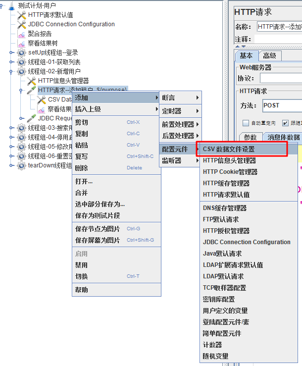 2、在线程组下添加元件CSV Data Set Config