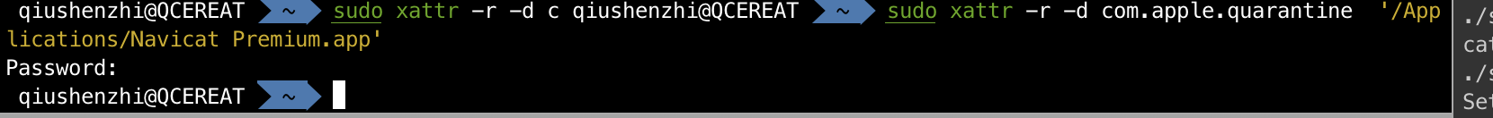 在终端中输入如下命令:sudo xattr -r -d com.apple.quarantine ,然后输入空格,先不要执行后面加上navicat的信息