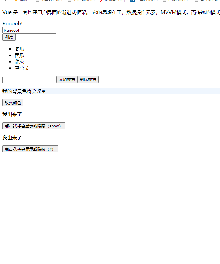 <!DOCTYPE html> <html> <head> <meta charset="UTF-8"> <title>基本模板指令</title> <script src="https://unpkg.com/vue@next"></script> </head> <body> <div id="Test"> <p> Vue 是一套构建用户界面的渐进式框架。 它的思想在于,数据操作元素,MVVM模式,而传统的模式是需要根据dom中存在的元素,然后通过js方式获取到 dom对象以便于操作对象的值 </p> <!-- 插值表达式 --> {{ msg }}<br> <!-- v-model --> <input type="text" name="v-model" id="model" v-model="msg" /> <br> <!-- v-on --> <button @click="reverseMessage">测试</button> <div> <ul> <!-- v-for --> <li v-for="(item,index) in foods">{{ item }}</li> </ul> <input type="text" v-model="tempFoods" /> <button @click=addFoods(tempFoods)>添加数据</button> <button @click=deteleFoods()>删除数据</button> </div> <!-- v-bind --> <div> <p :class="bgcolor">我的背景色将会改变</p> <button @click=changeStyle()>改变颜色</button> </div> <!-- v-show和v-if --> <div> <p v-show="tShow">我出来了</p> <button @click="changeShow()">点击我将会显示或隐藏(show)</button> </div> <div> <p v-if="tIf">我出来了</p> <button @click="changetIf()">点击我将会显示或隐藏(if)</button> </div> </div> <!--mount是将指定的组件挂载到Vue应用中 --> <!-- createApp是指创建Vue应用 --> <!-- this代指被Vue管理的对象 --> <!-- 使用v-model实现双向数据绑定 --> <!-- 双向数据绑定,指的是可以通过数据改变dom元素的值,也可以通过dom元素输入的值改变数据的值 --> <!-- v-for指令用于遍历数据动态的生成dom元素 --> <!-- v-if是条件判断的指令,用于控制dom元素是否会显示插入dom对象中, v-show有同样的效果,只是v-show使用css属性的display:none来控制的,dom元素始终在dom对象中 --> <!-- v-bind是对标签的属性值进行绑定操作 --> <script lang="ts"> const app = { data() { return { msg: 'Runoob!', foods: ["冬瓜", "西瓜", "甜菜", "空心菜"], tempFoods: '', bgcolor: 'bg', tShow: true, tIf: true } }, methods: { reverseMessage() { this.msg = "改变值了" }, addFoods(food) { if (food === '') { console.log("不能添加空的数据") } else { this.foods.push(food) console.log("添加成功") } }, deteleFoods() { this.foods.pop() }, changeStyle() { this.bgcolor = 'ba' }, changeShow() { this.tShow = !this.tShow console.log("tshow" + this.tShow) }, changetIf() { this.tIf = !this.tIf console.log("tIf" + this.tIf) } } } Vue.createApp(app).mount('#Test') </script> </body> <style> .bg { background-color: rgba(10, 124, 245, 0.067); } .ba { background-color: rgb(149, 124, 173); } </style> </html>