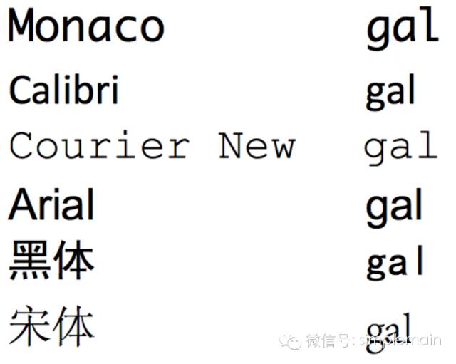 我们用多种常见字体,将所有英文和标点生成标准图案。这里简称模板图案。为什么要多种字体呢?因为对于同一个字符,在不同字体下,可能长的完全不一样,比如同样是gal,不同字体效果如下: