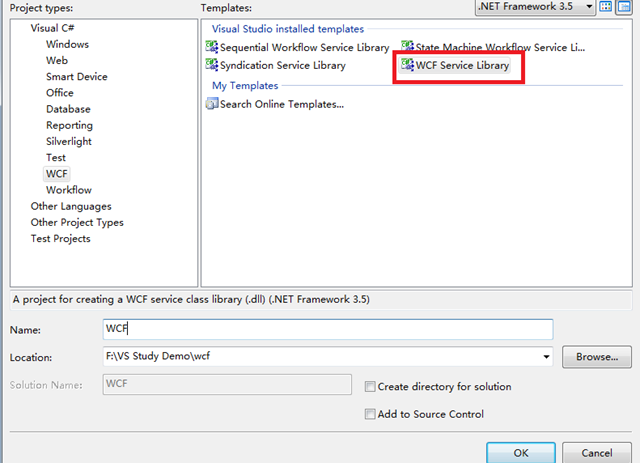 一,新建立一个WCF Service Libary ,如下图 ,默认会有一个App.config(配置文件) ,IService1.cs(接口),Service1.cs(实现)