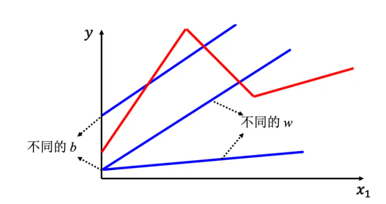 线性模型也许过于简单,x1 跟 y 可能中间有比较复杂的关系,对于线性模型,x1 跟 y 的关系就是一条直线,随着 x1 越来越高,y 就应该越来越大。显然线性模型有很大的限制,这一种来自于模型的限制称为模型的偏差,无法模拟真实的情况。所以需要写一个更复杂的、更有灵活性的、有未知参数的函数。红色的曲线可以看作是一个常数再加上一群 Hard Sigmoid 函数。Hard Sigmoid 函数的特性是当输入的值,当 x 轴的值小于某一个阈值(某个定值)的时候,大于另外一个定值阈值的时候,中间有一个斜坡。所以它是先水平的,再斜坡,再水平的。所以红色的线可以看作是一个常数项加一大堆的蓝色函数(Hard Sigmoid)。常数项设成红色的线跟 x 轴的交点一样大。常数项怎么加上蓝色函数后,变成红色的这一条线? 蓝线 1 函数斜坡的起点,设在红色函数的起始的地方,第 2 个斜坡的终点设在第一个转角处,让第 1 个蓝色函数的斜坡和红色函数的斜坡的斜率是一样的,这个时候把 0+1 就可以得到红色曲线左侧的线段。接下来,再加第 2 个蓝色的函数,所以第2 个蓝色函数的斜坡就在红色函数的第一个转折点到第 2 个转折点之间,让第 2 个蓝色函数