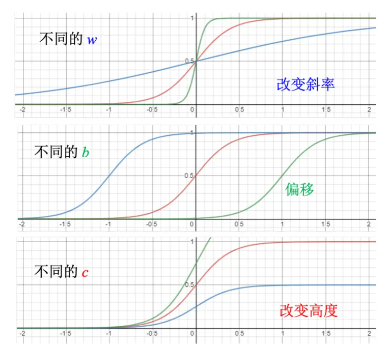 调整这里的 b、w 和 c 可以制造各种不同形状的 Sigmoid 函数,用各种不同形状的 Sigmoid函数去逼近 Hard Sigmoid 函数。如果改 w,就会改变斜率,就会改变斜坡的坡度。如果改了 b,就可以把这一个 Sigmoid 函数左右移动;如果改 c,就可以改变它的高度。所以只要有不同的 w 不同的 b 不同的 c,就可以制造出不同的 Sigmoid 函数,把不同的Sigmoid 函数叠起来以后就可以去逼近各种不同的分段线性函数;分段线性函数可以拿来近似各种不同的连续的函数。