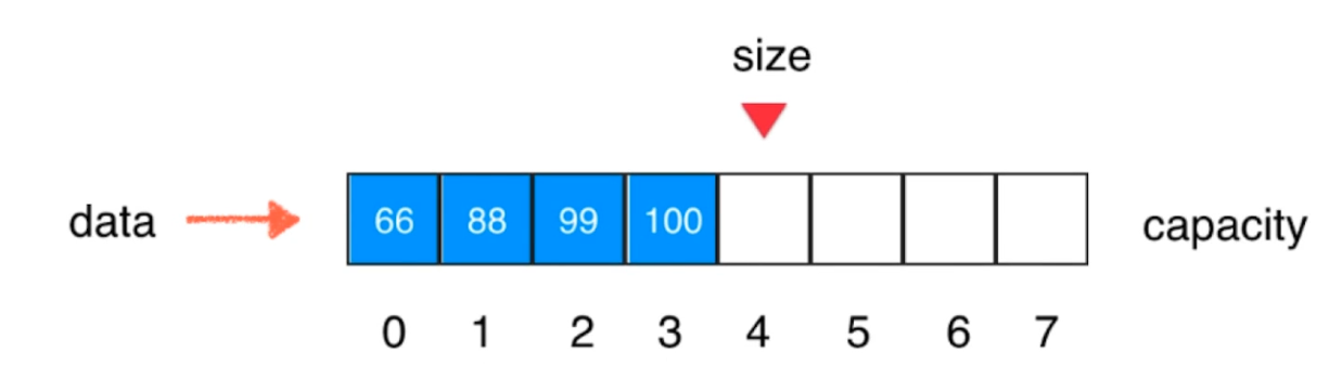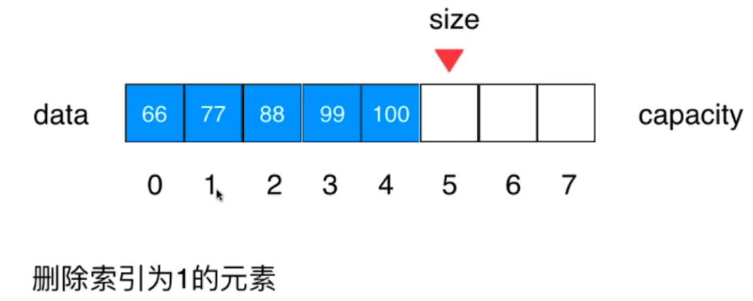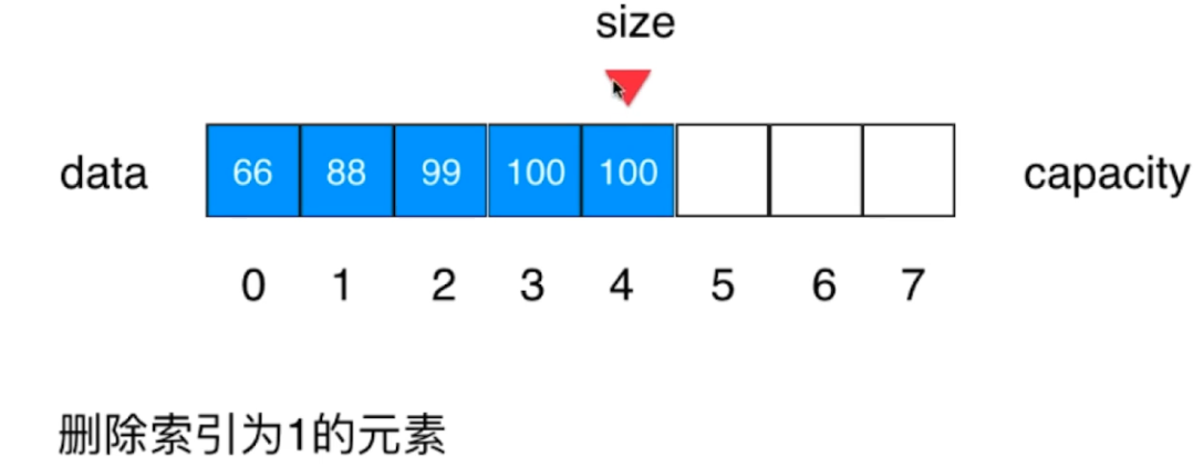 删除时,移动元素,从前面到后面,将索引为2的赋值给索引1,然后再将3赋值给2,这样一直到size-1(最后一个元素),最后维护size,size--。
