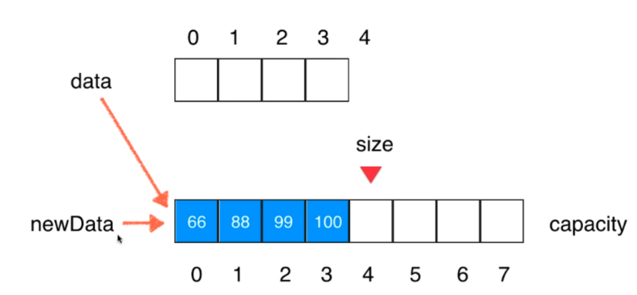 将data中的所有成员放到newData中,并且将data指向新的数组。原数组因为没有被引用了,所以会被Java的自动回收机制回收,newData在方法结束后就失效了,最终我们会得到一个更大的data