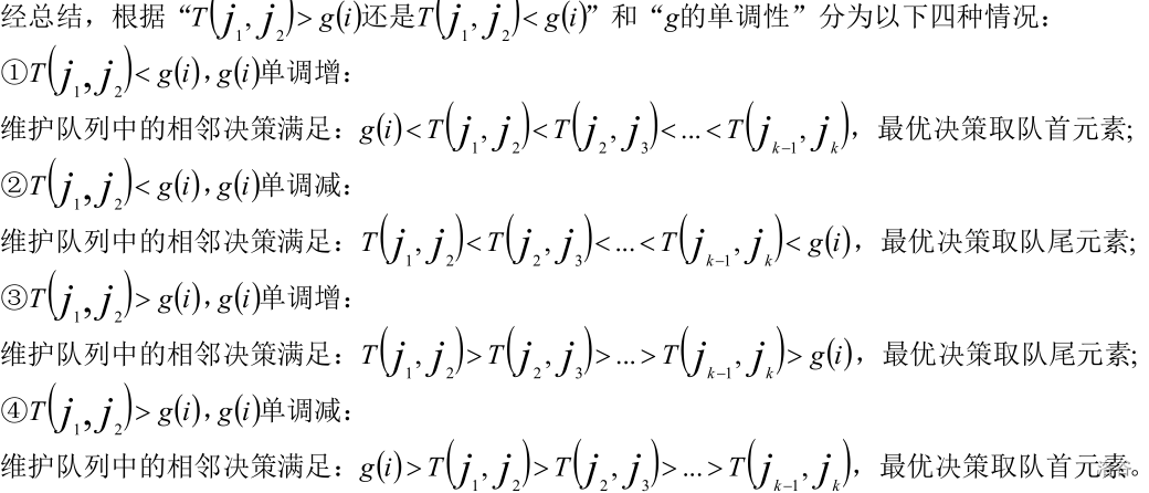 维护一个队列(元素从小到大)使得队头 \(k(j_1, j_2) > 2g_i\) 即可,这样保证, 当一个新的决策变得更优秀, 我们可以及时将其弹出, 且所有的 \(k\) 递增。